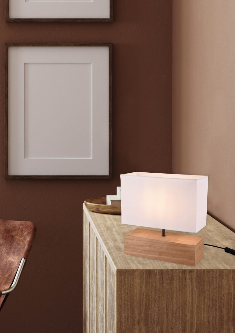 Lampa nocna biurkowa podłużna prostokątna drewniana podstawa biały abażur z tkaniny RL R50181030 Woody E27