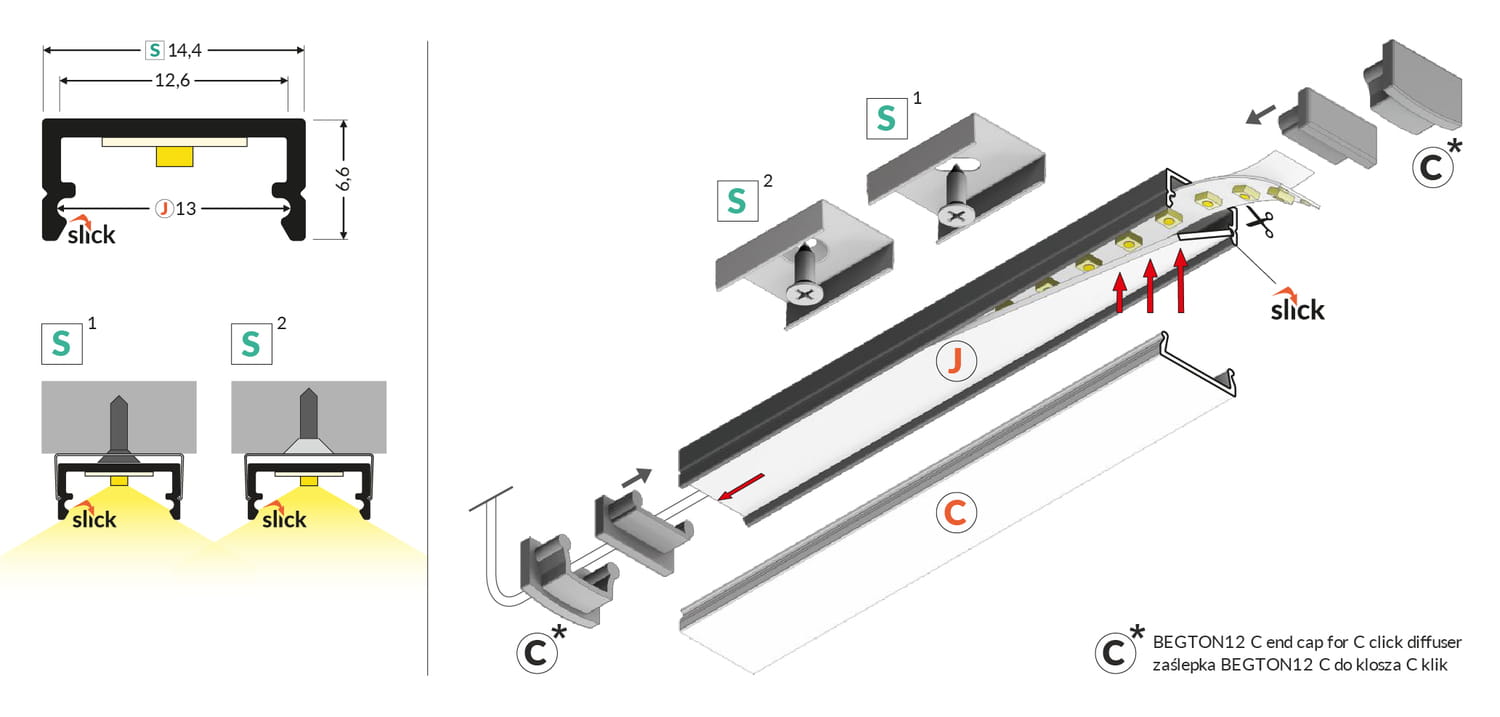 Aluminiowy profil do taśm LEDTaśmy LED to elastyczne paski wyposażone w diody LED, które emitują światło. Dzięki swojej elastyczności i niewielkim rozmiarom mogą być instalowane w miejscach trudnodostępnych lub wymagających precyzyjnego oświetlenia. W zastosowaniach funkcjonalnych znajdują miejsce jako dodatkowe oświetlenie robocze w kuchniach, łazienkach i biurach. Są również wykorzystywane w reklamie i ekspozycjach, podświetlając witryny sklepowe i ekspozycje towarów. Na zewnątrz używa się ich do podświetlania elewacji budynków, tarasów i ogrodów, a w motoryzacji do oświetlenia wnętrz samochodów i podświetlania podwozi. Dlaczego warto zastosować profil do taśmy LED?Umieszczenie taśmy LED w profilu aluminiowym przynosi liczne korzyści. Poza estetycznym wyglądem i możliwością tworzenia ciekawych kształtów, takich jak ciągłe linie na suficie, ścianie czy meblach, profil aluminiowy pełni ważną funkcję ochronną. Chroni taśmę LED przed uszkodzeniami mechanicznymi, takimi jak zarysowania, uderzenia czy przypadkowe zgniecenie, które mogłyby wpłynąć na jej wydajność i trwałość. Dodatkowo, profil aluminiowy działa jak radiator, efektywnie odprowadzając ciepło generowane przez diody LED. Dzięki temu, diody nie nagrzewają się nadmiernie, co nie tylko poprawia ich wydajność, ale także znacząco wydłuża ich żywotność. Zastosowanie klosza w profilu zapewnia równomierne rozpraszanie światła, redukując efekt olśnienia i tworząc przyjemne, równomierne oświetlenie. W efekcie, profil aluminiowy z kloszem nie tylko poprawia funkcjonalność i trwałość taśmy LED, ale również podnosi walory estetyczne każdego wnętrza. Jak zamontować taśmę LED do profilu?Każda taśma LED jest wyposażona z drugiej strony w taśmę klejącą dwustronną, co znacznie ułatwia montaż. Aby zamocować taśmę LED w profilu aluminiowym, wystarczy odkleić jedną stronę taśmy klejącej i przycisnąć ją do wnętrza profilu. Ten prosty proces zapewnia solidne przymocowanie taśmy LED, eliminując potrzebę stosowania dodatkowych klejów czy narzędzi. Jak zamontować profil do taśm LED?Montaż profili LED może być realizowany na różne sposoby, w zależności od rodzaju profilu i specyfiki instalacji.