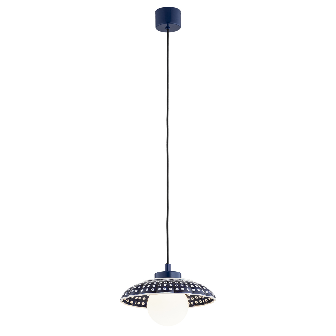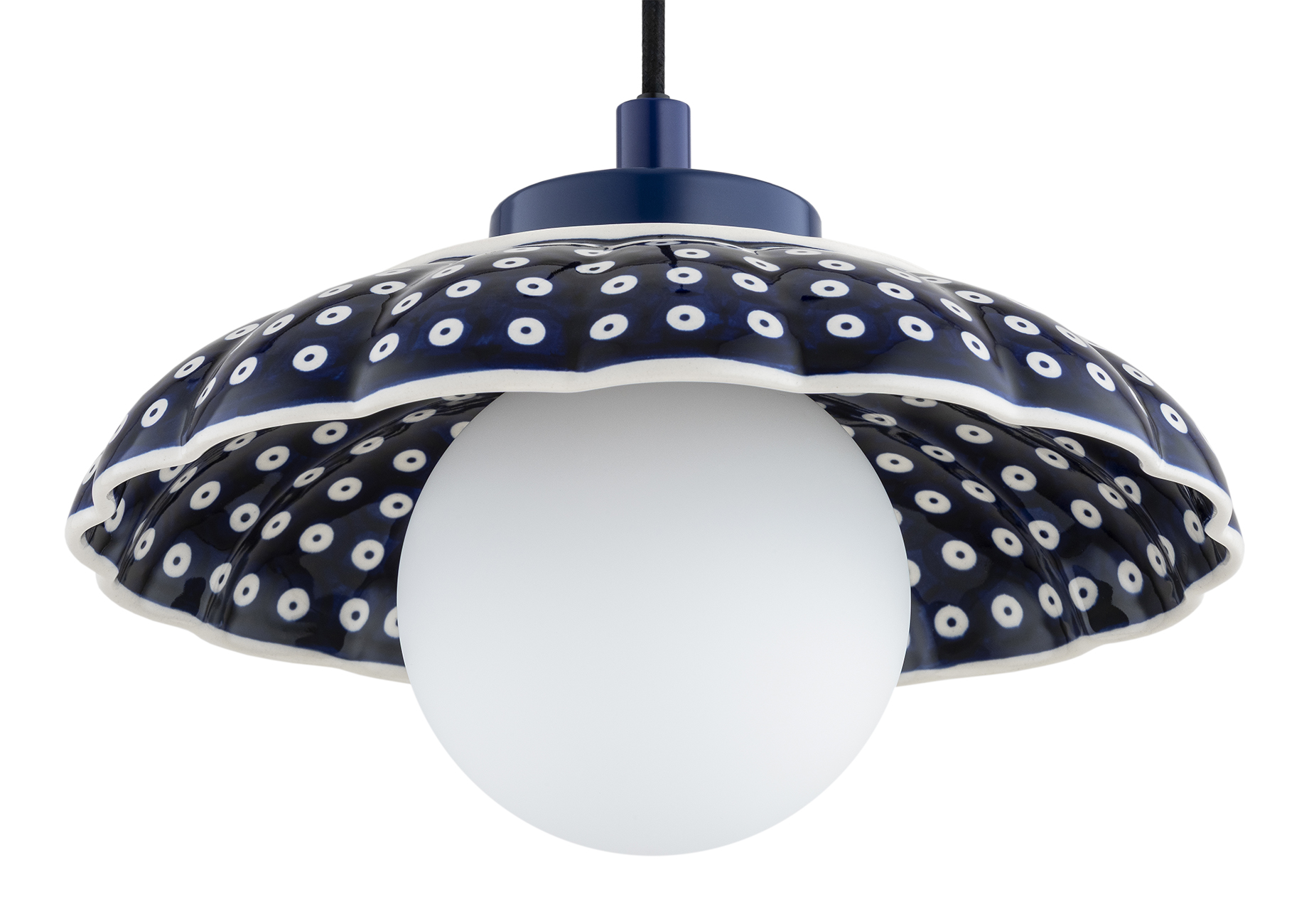 Ceramiczna lampa wisząca Bolesławiec granat z białymi stemplami i klosz kula szklana Argon 8948 Boll G9 IP44