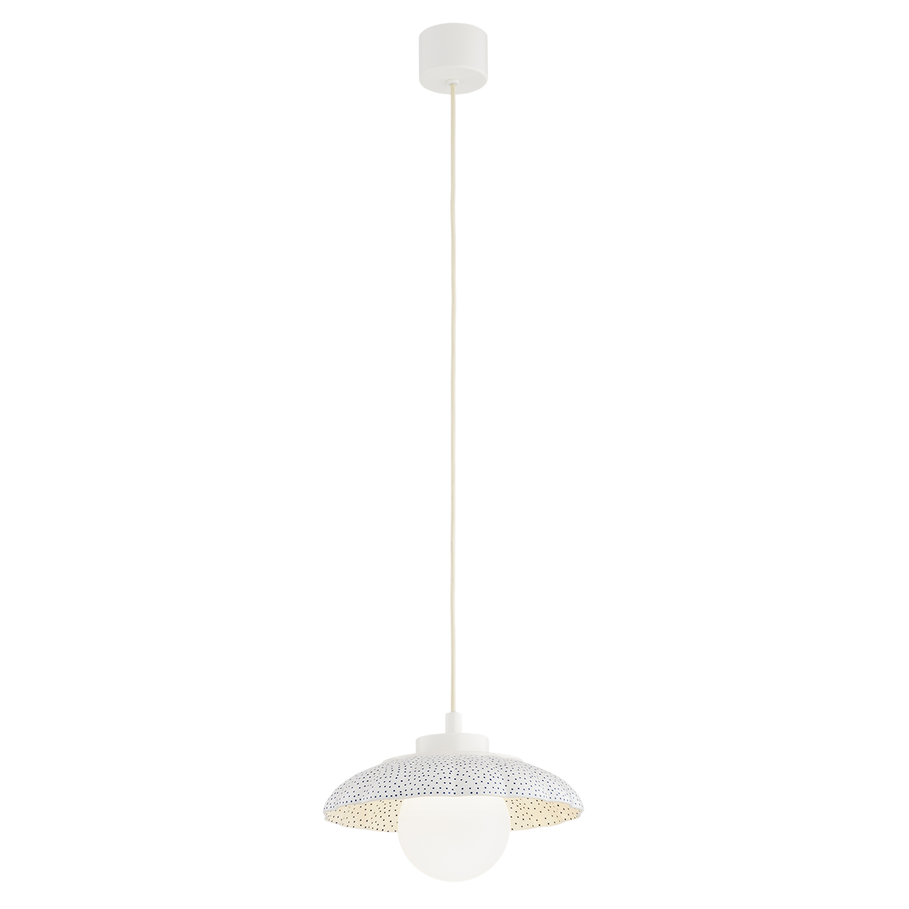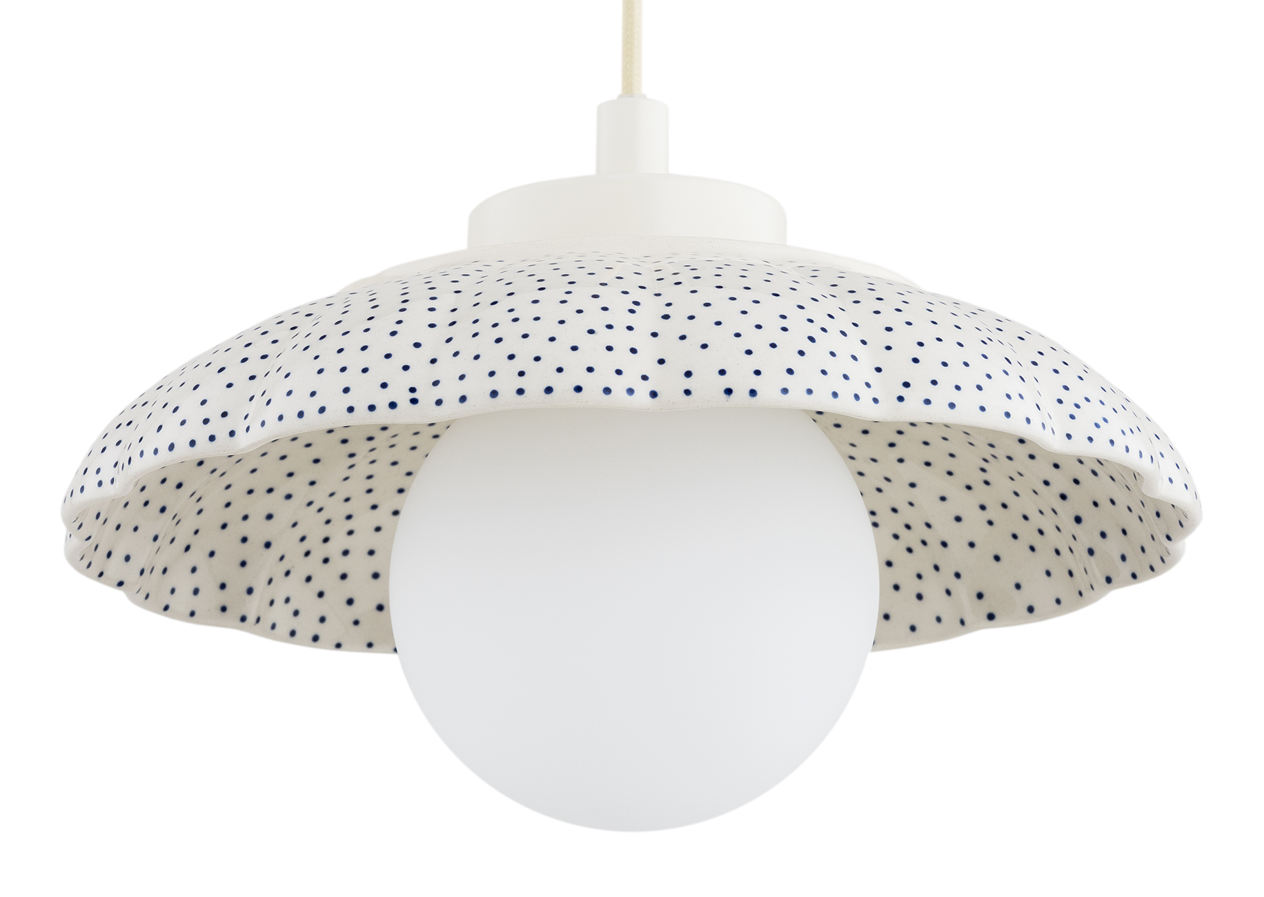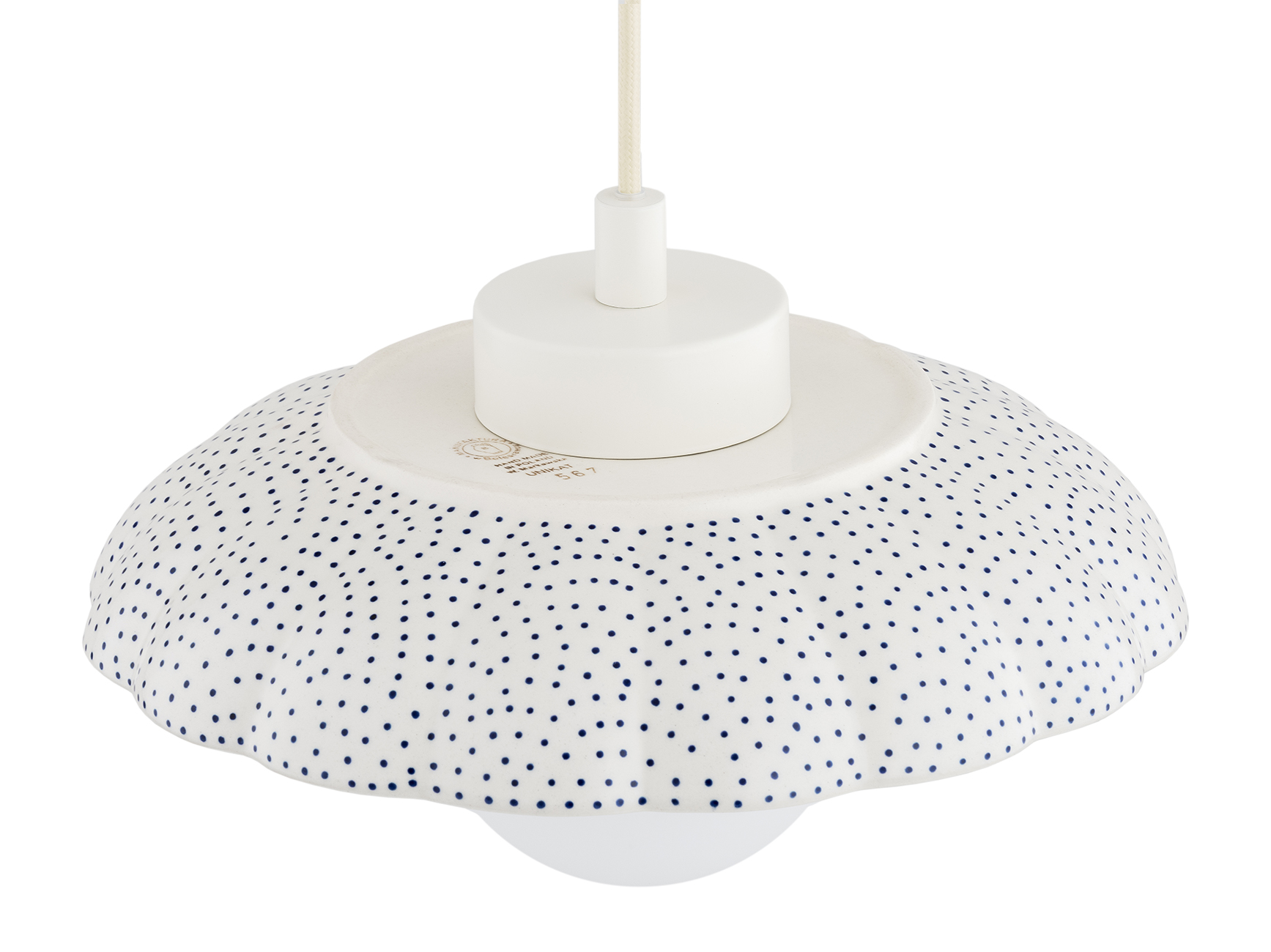 Ceramiczna lampa wisząca Bolesławiec kremowy z granatowymi stemplami i klosz kula szklana Argon 8947 Boll G9 IP44