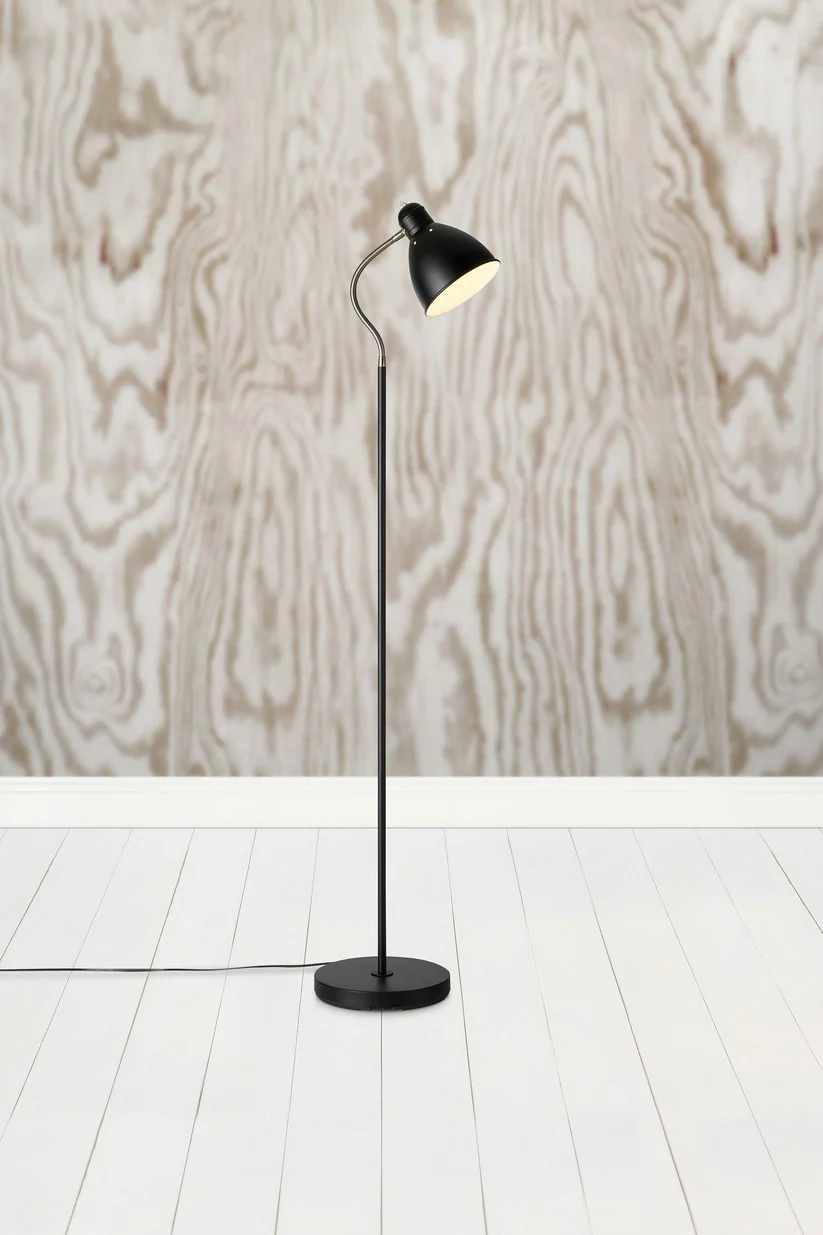 Czarna lampa podłogowa z metalowym kloszem na giętkim ramieniu MarkSlojd 108016 Nitta E27 145cm