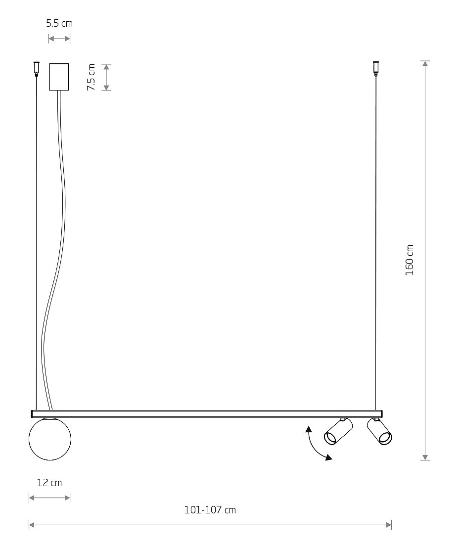 Czarna lampa wisząca listwa 101cm z 2 reflektorkami GU10 i szklaną kulą G9 Nowodvorski 11447 Fourty III