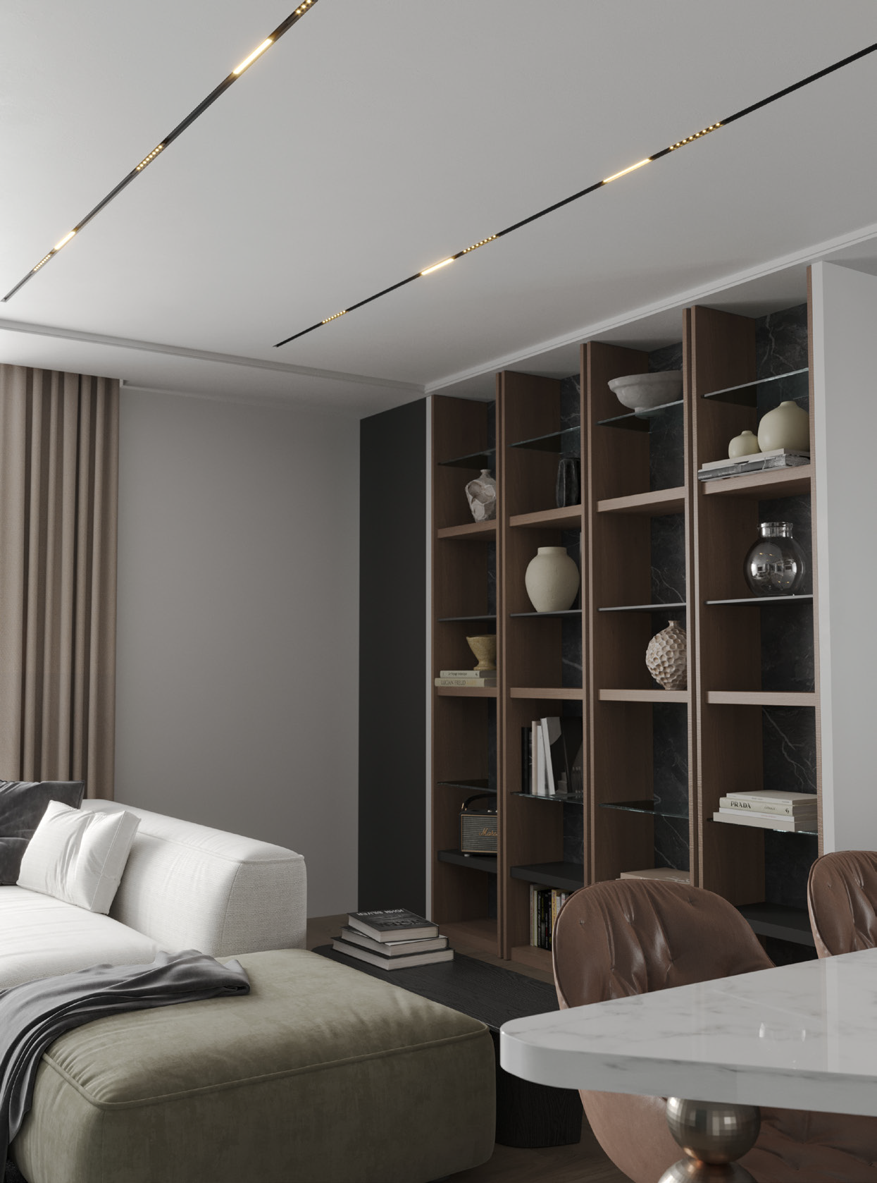 Do zasilania można wykorzystać zasilacz zewnętrzny, podłączany przez końcówkę zasilającą, lub zasilacz wewnętrzny montowany bezpośrednio w szynie. Ten drugi to wyjątkowe rozwiązanie, ponieważ mimo że jego wysokość wynosi około 3 cm i wystaje ponad poziom szyny, to wciąż jest kompaktowy jak na tak niski system - większość producentów nie oferuje tak małych zasilaczy. Oferta opraw obejmuje podstawowe modele: lampy liniowe z kloszem mlecznym lub z diodami oraz reflektory tuby z wąskim kątem świecenia. System został też poszerzony o oprawy obracane, przechylane oraz większe modele okrągłe - z kloszem mlecznym lub diodami - wszystkie w ciepłej barwie 3000K. Podobnie jak w systemie Magnetic, również tutaj dostępne są wersje lamp wyposażonych w sterownik Zigbee, który umożliwia zdalne sterowanie, w tym ściemnianie, zmianę temperatury barwowej i grupowanie. |