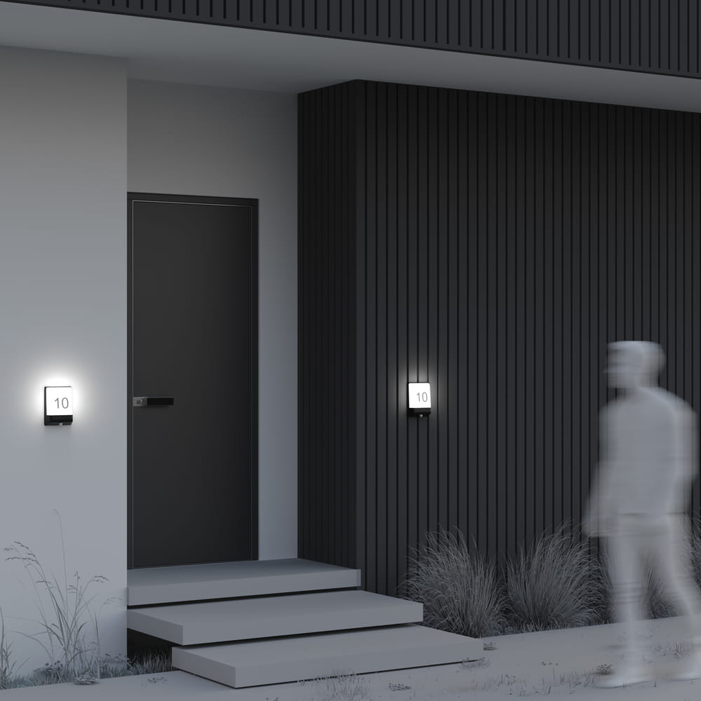 Grafitowy zewnętrzny kinkiet z miejscem na numer domu i czujnikiem ruchu i zmierzchu Maytoni O448WL-L9GF3KSR Row LED 9W 3000K IP44