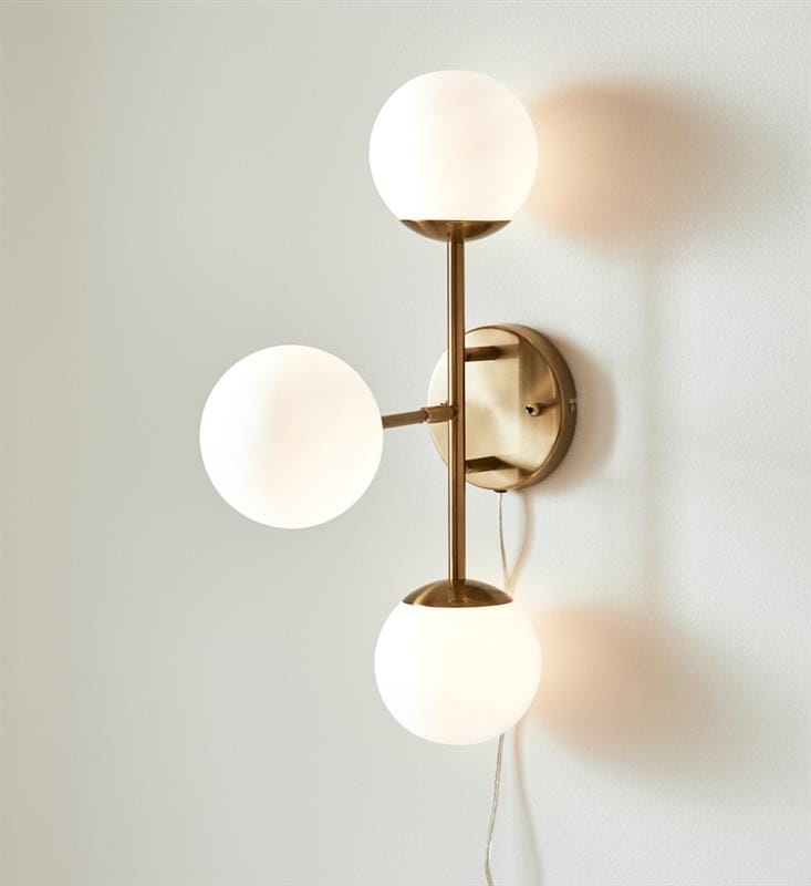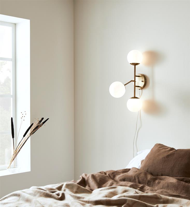 Lampa ścienna kinkiet złoty z włącznikiem i regulowanym ramieniem mleczne klosze szklane kulki MarkSlojd 108254 Trinity 3xG9