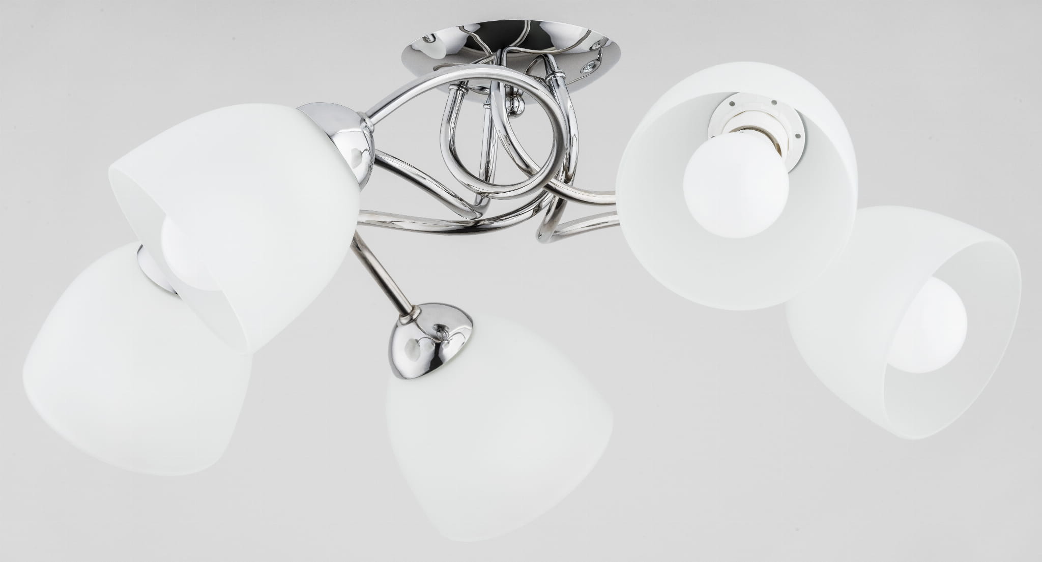 Lampa sufitowa do salonu z białymi kloszami zakręcony chromowany stelaż Silia Alfa 27505 5xE27 25cm x 68cm