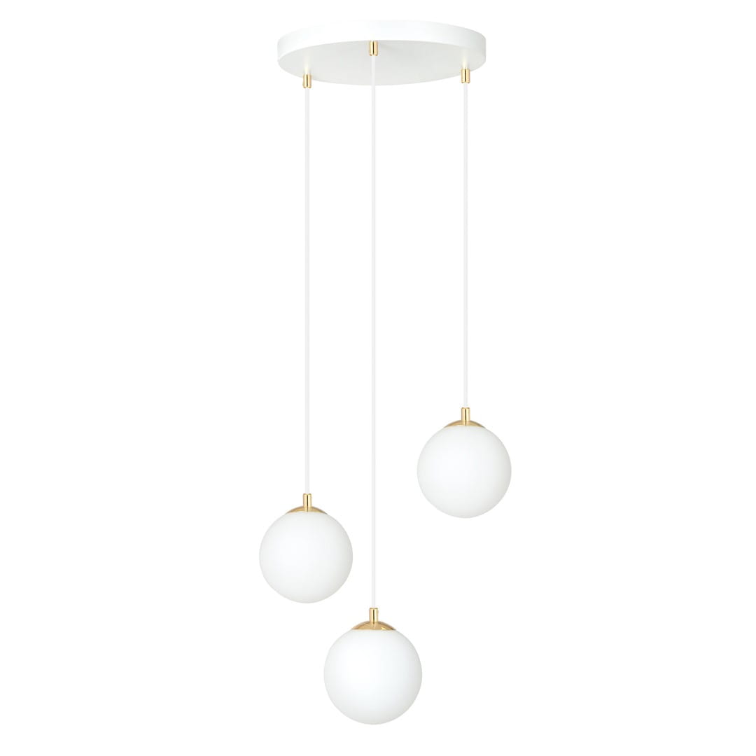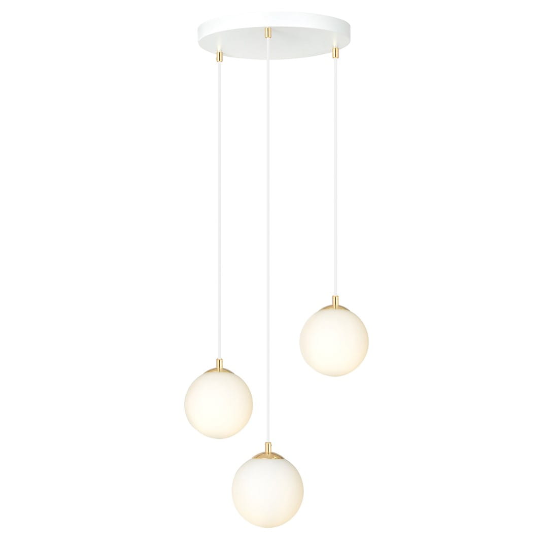 Lampa wisząca białe kule pod złotymi talerzykami na białym kablu Emibig 1244/3 Royal 3xE14 40cm