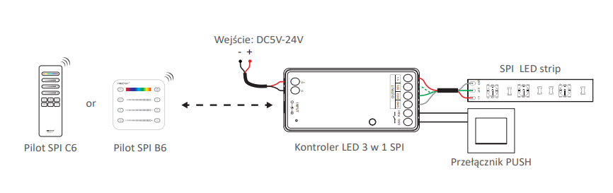 Sterownik do świetlnej fali na taśmie LEDPilot SPIR3 przeznaczony jest do sterowania taśmą LED z płynnym efektem świetlnym to coś więcej niż zwykłe oświetlenie. Po włączeniu światło startuje z jednej strony i płynnie przesuwa się wzdłuż całej taśmy, tworząc efekt rozchodzącej się fali. To nowoczesny sposób, by nie tylko rozjaśnić wnętrze, ale też nadać mu wyjątkowego charakteru. Co jest potrzebne do działania?Aby taśma działała prawidłowo, potrzebny jest zasilacz 24V, sterownik SPIR3 oraz pilot C6-B. Wszystkie te produkty znajdziesz w zakładce „podobne produkty”. Sterownik można dodatkowo połączyć z tradycyjnym przyciskiem ściennym - wtedy obsługa staje się jeszcze wygodniejsza. Sterowanie i funkcjePilot, który należy dokupić oddzielnie, pozwala nie tylko włączać i wyłączać światło, ale także sterować efektami. Możesz:
