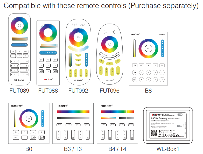 Obsługuje taśmy 12V do 6A oraz 24V do 12A, oferując szerokie możliwości konfiguracji. Zasięg do 30 metrów zapewnia komfort sterowania. Sterownik pasuje do pilotów i paneli o numerach: FUT089, FUT088, FUT092, FUT096, B8, B0, B3 / T3, B4 / T4, WL-Box1. |
